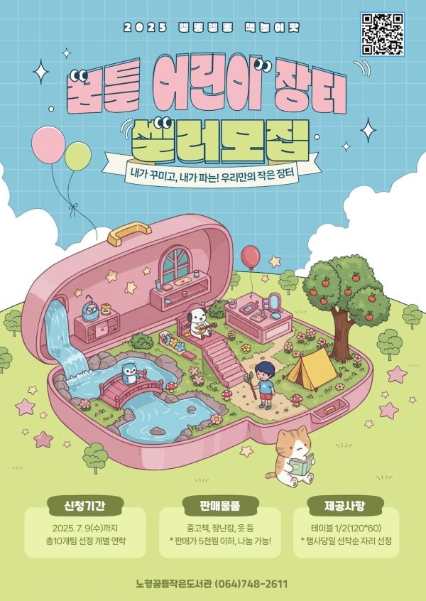 셀러는 총 10명을 선정하며, 제주 지역 초등학생이면 누구나 신청할 수 있다. 참여를 희망하는 어린이들은 간단한 신청서를 작성해 노형꿈틀작은도서관 인스타그램 프로필 링크를 통해 접수하면 된다.