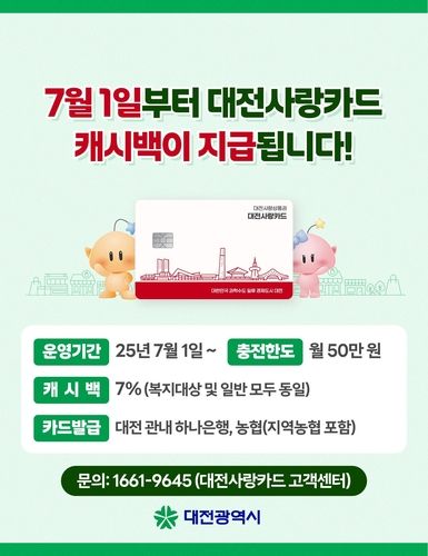 대전시는 대전사랑카드(기존 온통대전)를 월 구매 한도 50만원 내 7% 캐시백 지급 정책으로 7월부터 운영한다고 밝혔다. 이에 지난 1일부터 카드 캐시백이 지급됐다.
