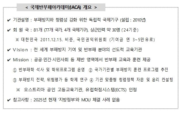 IACA는 유엔마약범죄사무소(UNODC), 오스트리아 정부, 유럽부패방지총국(OLAF) 등이 2010년 10월 설립한 최초의 반부패 교육 전담 국제기구로, 우리나라는 2011년 12월 IACA 협정을 비준했다. 현재 IACA에는 77개 국가와 4개 국제기구가 회원으로 활동하고 있다.