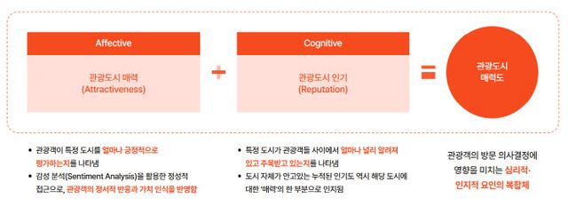해당 분석 모델은 미국 퍼듀대학교 CHRIBA 연구소와 경희대학교 H&T 애널리틱스 센터가 공동 개발했다. 기존 관광 인프라 중심의 평가 방식에서 벗어나, 도시가 SNS에서 얼마나 자주 언급되고 주목받는지를 ‘인기도’로, 언급에 담긴 감정(긍정적 반응 등)을 ‘매력도’로 분류해 평가한 것이 특징이다. 도시 매력도는 △도시의 아름다움과 자연경관 △문화와 역사 △체험 콘텐츠 △환대성 등 네 가지 부문으로 나뉘어 정밀하게 측정됐다.