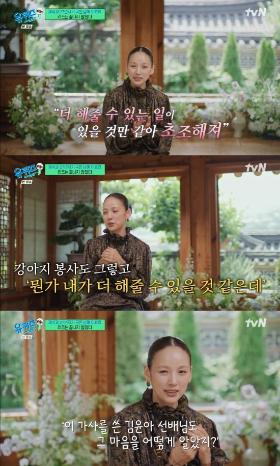 이효리는 "'더 해줄 수 있는 일이 있을 것만 같아 초조해져' 이 부분이 되게 저는 많이 와닿는다. 제가 항상 부모님한테도 남편한테도 제 지인들한테도 방송에도 강아지 봉사도 뭔가 내가 더 해줄 수 있을 거 같은데 하면서 그 마음이 되게 사랑의 마음인 거 같다"라며 고백했다.