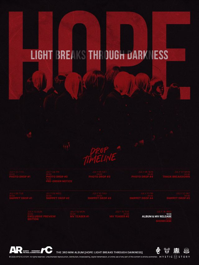 소속사 미스틱스토리에 따르면 아크는 오늘(2일) 공식 사회관계망서비스(SNS)를 통해 미니 3집 ‘호프’(HOPE)의 드롭 타임라인(Drop Timeline)을 게재, 16일 컴백 소식을 알렸다.