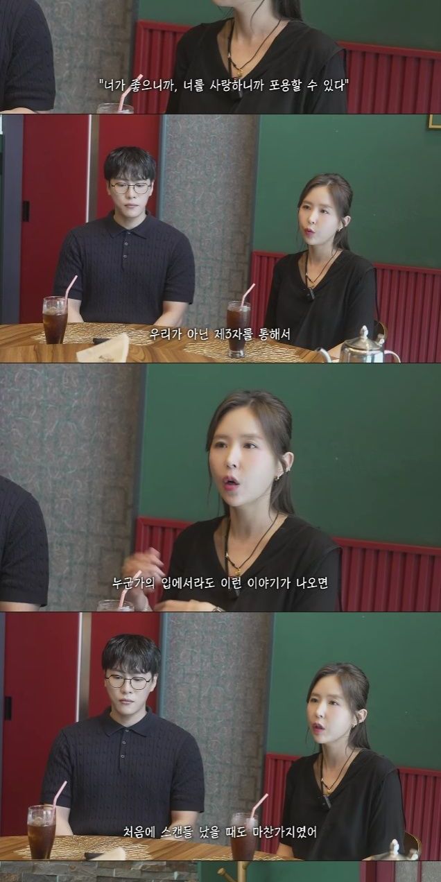 "걱정어린 시선이 있을 수 있다고 생각한다. 처음 스캔들 날 떄도 마찬가지였다. 이 사람의 책임감이 오히려 좋아 보였다. 나몰라라 하는 상황이 아니라 자기 아이를 지키려고 하고 책임감 있게 케어하는 모습이 좋아 보였다. 내게도 저런 모습을 보여줄 수 있겠구나 싶었다"라며 진솔하게 고백했다.
