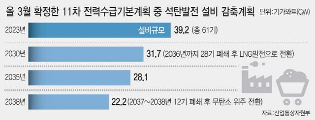 2일 산업통상자원부에 따르면 국내 61개 석탄화력 발전소 중 40기는 11차 전기본에 따라 13년 후인 2038년까지 폐쇄될 예정이다. 나머지 21기 역시 2040년 석탄발전 전면 폐지 공약에 따라 운영 종료 시점이 앞당겨질 수 있다.