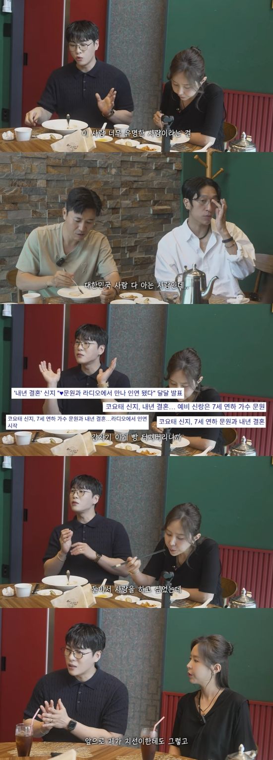 지난달 27일 촬영한 것으로 추정되는 이 영상에서 신지는 코요태 멤버 김종민, 빽가와 식사 자리를 갖고 7살 연하 예비 신랑 문원을 정식으로 소개했다. 앞서 지난달 23일 신지가 듀엣곡을 함께한 가수 문원과 웨딩 촬영을 마쳤고 내년 상반기 결혼한다는 깜짝 소식이 전해진 바 있다.