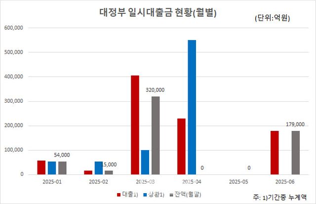 3일 국회 기획재정위원회 소속 박성훈 국민의힘 의원이 한은에서 제출받은 자료에 따르면 정부는 지난달 일시대출을 통해 17조 9000억원을 차입했다. 지난 5월에 그동안 일시대출로 빌렸던 돈을 모두 갚아 6월 말 기준 누적 잔액도 17조 9000억원이다.
