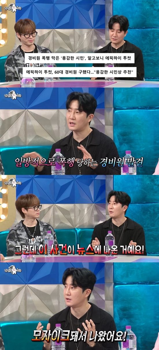 이날 유세윤은 투컷에게 "셀프 미담 방출로 은은한 관종임을 인증했다는 얘기가 있다"라며 질문했다. 투컷은 "용감한 시민이다. 웃긴 게 제가 널리 알리고 싶어서 그렇게 한 게 아니다. 저희 아파트 단지에 경비원분이 배달하시는 분한테 일방적으로 폭행을 당하고 있었다"라며 당시 상황을 설명했다.
