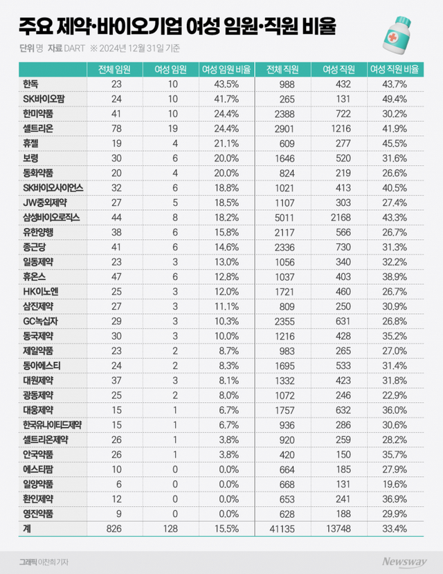 유가증권시장(코스피)과 코스닥시장에 상장한 기업 중 지난해 말 기준 주요 상장 제약·바이오기업 30곳의 여성임원은 128명으로 집계됐다. 이는 전체 임원 826명 가운데 15.5%에 불과하다.