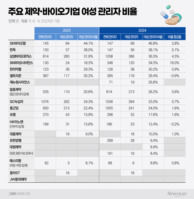 여성 관리자 비율이 OECD 평균을 넘은 곳은 SK바이오팜(46.9%), 한독(38.1%), 삼성바이오로직스(36.5%), SK바이오사이언스(34.5%) 네 곳에 머물렀다.