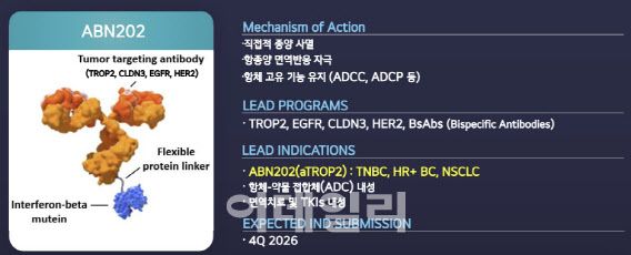ABN202는 면역조절 사이토카인인 인터페론-베타(IFN-β)와 항체를 결합한 플랫폼이다. 기존 ADC가 암 세포를 탐색하는 항체에 페이로드(화학항암제)를 결합한 2세대 항암제라면, ABN202는 3세대 항암제인 면역항암제를 항체에 붙인 형태다. 이 같은 기술 기반의 항암제 개발에 성공하면 ADC의 표적성은 가져가면서 ADC의 한계로 여겨지던 부작용 문제를 개선할 수 있다. ADC는 화학항암제를 활용하기 때문에 독성 이슈에서 자유롭지 않은 반면, 면역항암제는 체내 면역체계를 활성화시켜 암 세포를 공격하는 것이기 때문에 비교적 부작용 이슈가 적다는 점에서 ABN202가 눈에 띄는 장점을 갖고 있다는 것이 회사측 설명이다.