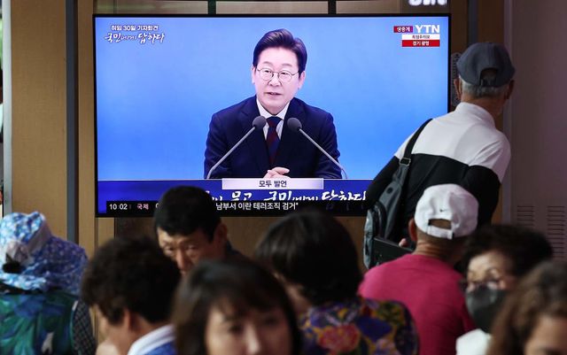 3일 오전 서울역 대합실에서 시민들이 이재명 대통령 ‘취임 한달’ 기자회견 생중계 영상을 시청하고 있다. /뉴스1