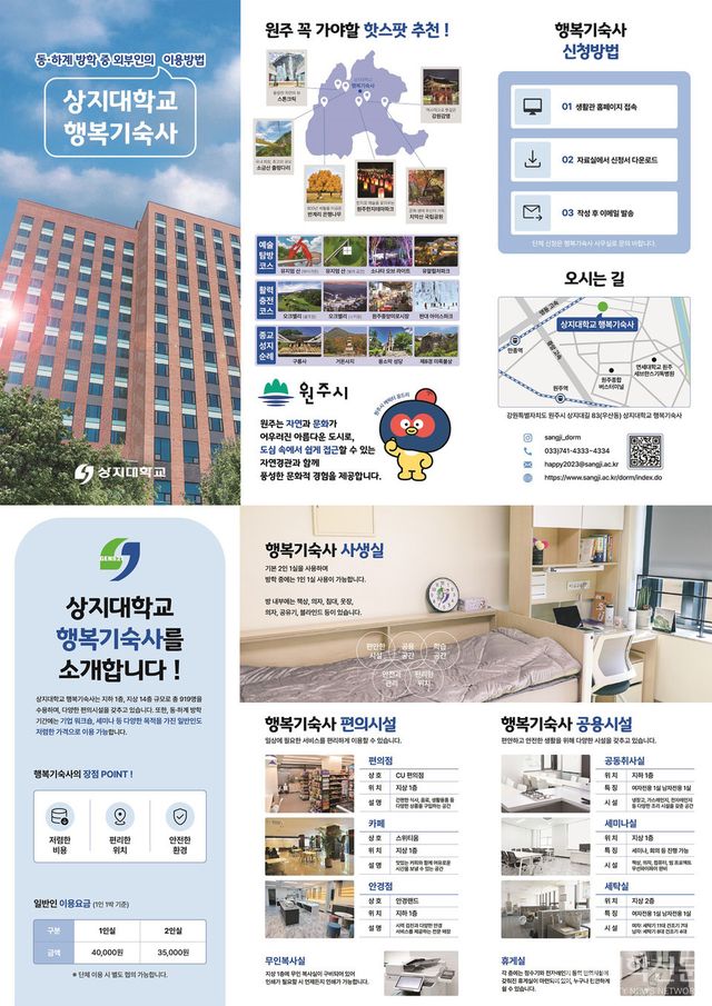 이용 신청은 상지대 행복기숙사 홈페이지 자료실에서 신청서를 내려받아 작성한 뒤, 이메일로 제출하면 된다.