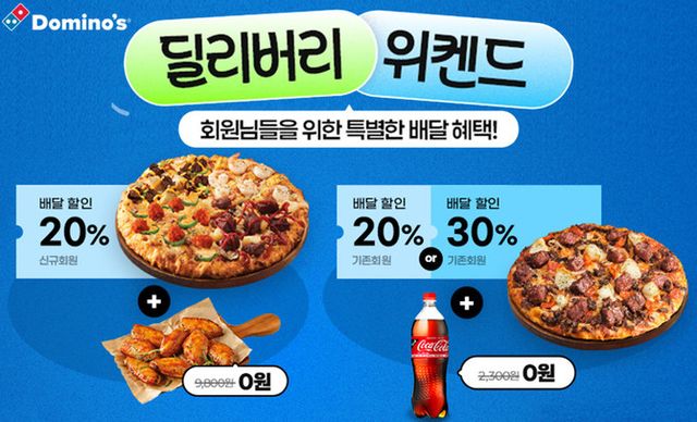 도미노피자의 '딜리버리 위켄드'는 자사채널(홈페이지, 모바일, 웹, 자사앱) 모든 회원을 대상으로 진행되며, 7월1일부터 8월3일까지 신규가입 회원 한정 배달 20% 할인 상시쿠폰 사용시 인기 사이드 메뉴인 웨스턴 핫윙을 무료로 제공한다. 이 외에도 기존 회원 중 Regular 등급은 배달 20% 할인, Premium, VIP, Royal 등급 회원이 배달 할인 30% 상시쿠폰을 사용하면 코카-콜라 1.25ℓ를 제공한다.
