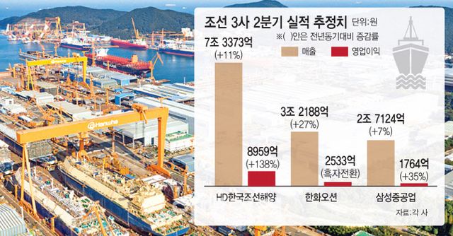 3일 에프앤가이드에 따르면 HD현대의 조선해양 사업 부문 중간지주사인 HD한국조선해양의 올해 2분기 매출은 7조3373억원, 영업이익은 8959억원, 순이익은 7496억원으로 예상된다. 지난해 같은 기간과 비교하면 각각 11%, 138%, 110%가 늘어난 수치다.