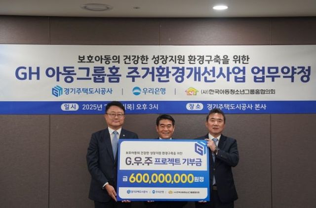 [와이뉴스] 경기주택도시공사(GH)는 수원 본사에서 우리은행, 한국아동청소년그룹홈협의회와 함께 ‘아동그룹홈 주거환경 개선사업’ 업무협약을 체결했다고 3일 밝혔다. 이번 협약에 따라 ‘G.우.주 프로젝트(GH + 우리은행 아동그룹홈 주거환경 개선사업)’가 본격 착수된다.