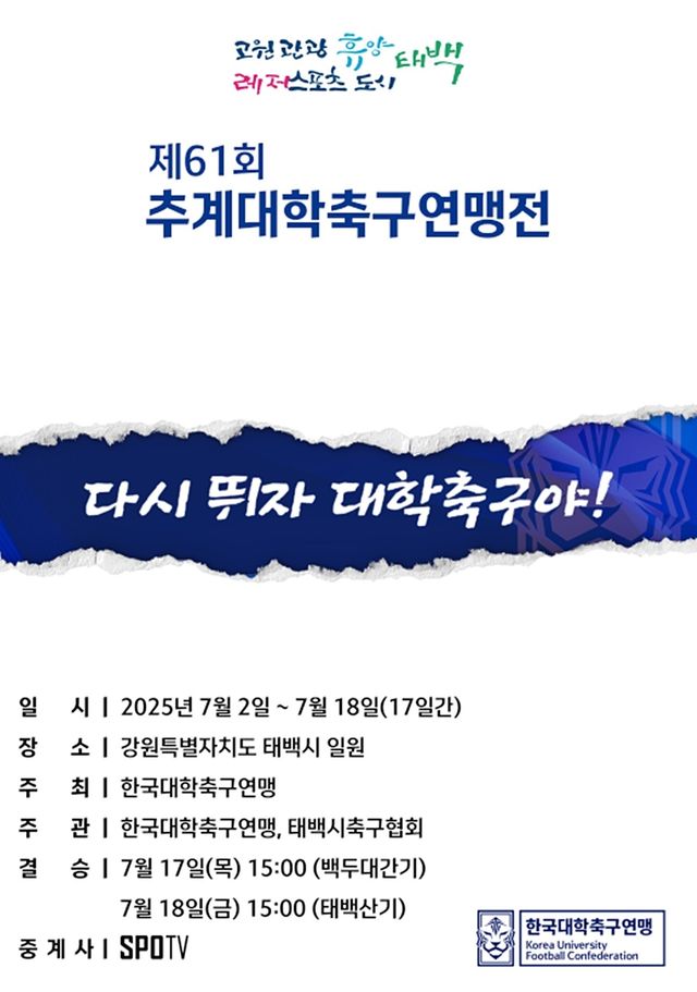 한편 한국대학축구연맹이 주최하는 제61회 추계대학축구연맹전이 오는 18일까지 강원특별자치도 태백시 일원에서 열린다. 전국 81개 대학 축구부가 참가하며 백두대간기(40개 팀)와 태백산기(41개 팀)로 나뉘어 대학축구 최강의 자리를 두고 치열한 경쟁을 벌인다.