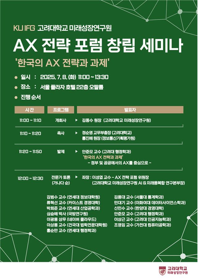 창립 세미나에서는 김동수 고려대 미래성장연구원장의 개회사와 정순영 고려대 교무부총장, 홍진배 정보통신기획평가원 원장의 축사에 이어, 안준모 고려대 교수의 ‘한국의 AX 전략과 과제’ 발제가 예정돼 있다. 이후에는 이성엽 위원장의 사회로 김범수(연세대), 김용대(서울대), 류혁선(KAIST), 민대기(이화여대), 박희준(연세대), 신민수(한양대) 교수 등과 산업계 전문가들이 참여하는 종합토론이 진행된다.