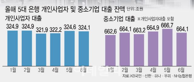 3일 금융권에 따르면 KB국민·신한·하나·우리·NH농협은행 등 5대 시중은행의 지난 6월 말 기준 개인사업자 대출 잔액은 324조 886억원으로 집계됐다. 전달인 5월(324조 5554억원)보다 4668억원 줄어든 수치다. 5월 한 달간 소폭이나마 반등했던 개인사업자 대출 잔액은 한 달 만에 다시 감소세로 전환됐다.