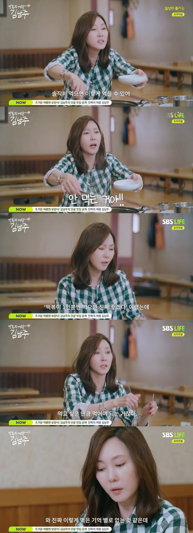 김남주는 스태프를 보며 "촬영 이거 너무 좋다. 내가 이렇게 마음껏 먹고 싶은 만큼 먹어야 하는 거잖아. 안 먹으면 안 되잖아. 그러면 왜 찍어. 진짜 이렇게 먹은 기억이 별로 없다"라며 마음껏 식사할 수 있는 것에 감사함을 전했다.