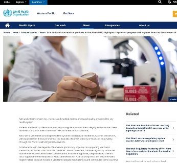 WHO는 이 기사에서 ▲코로나19 대유행 시 신속하고 정확한 코로나19 진단기술 확보 ▲글로벌 기준이 반영된 의약품법 제정(2024.9월)을 통한 허가체계 간소화 ▲규제기관 담당자의 역량 강화 등 베트남의 규제 수준 제고와 보건위기 예방 및 대응 역량 강화에 식약처가 기여했다고 다뤘다.