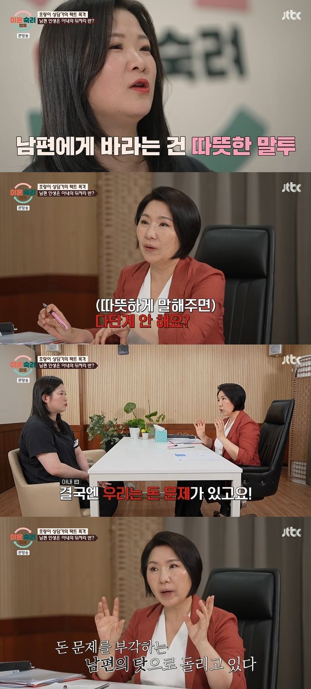 이호선 교수는 "얘기를 하다 보면 '나를 고치고 싶어요'라고 얘기하시는데 결국에는 '저희는 돈 문제가 있고요. 돈 문제에 대해서 남편이 이렇게 말해요'라고 이야기를 한다. 결론적으로 '남편의 문제도 있다'라는 얘기를 계속하는 거다"라고 따끔하게 이야기했다.