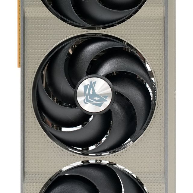 그래픽 카드의 성능에 가장 중요한 역할을 하는 냉각설계 부분을 살펴보자. 전면에는 3개의 트리플 에어로커브 팬이 위치한다. 회전하는 이 냉각팬의 블레이드(날개)는 공기흐름을 방해하지 않도록 공기역학을 적용해 유선형으로 꺾여 있다. 회전하는 가운데 더 높은 공기압력을 만들면서 흐름을 방해하지 않기에 빠르게 발열을 해소한다.
