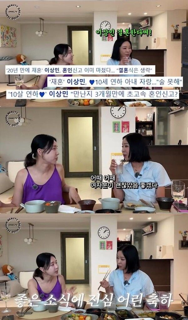 뉴시스 보도에 따르면, 이혜영은 3일 유튜브 채널 '채정안TV'에서 "이상민 결혼한다며"라고 언급했다. 그룹 '샵' 출신 이지혜는 "JTBC '아는 형님' 피로연에 초대 받아서 다녀왔다"고 털어놨고, 이혜영은 "어떠냐. 여자분 괜찮았으면 좋겠다. 진짜 이왕이면 잘 살아야지"라고 했다. 이지혜는 "언니 진짜 너무 착하다"며 놀랐다.