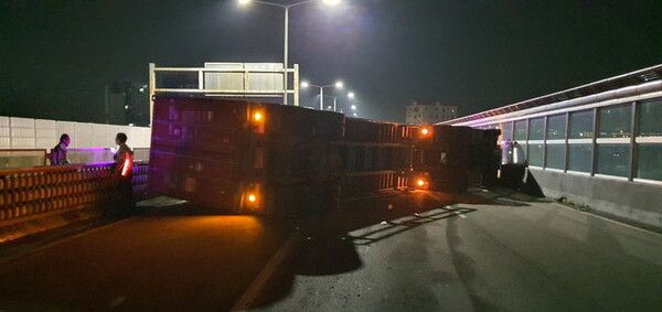 사고로 트레일러가 도로를 가로막았고, 경찰은 사고 수습을 위해 오전 1시30분께 관문대로 시외방향 도로를 전면 통제한 채 진입 차량을 우회 조치했다.