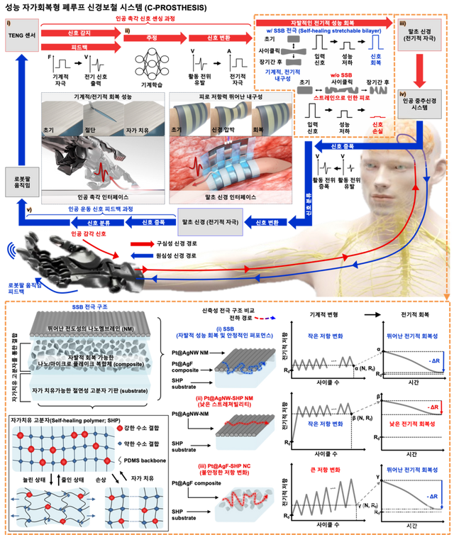 기존 신경보철 시스템은 신경 손상 환자의 감각 및 운동 기능 회복에 필수적이지만, 착용이나 이식 과정에서 반복되는 기계적 손상과 피로로 인해 전기적 성능이 저하되는 문제가 있었다. 특히 체내 이식형 시스템에서는 장기간 안정적인 작동을 위한 자가치유 기술과 머신러닝 기반 피드백 기술의 결합이 미흡한 상황이었다.