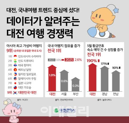최근 발표된 다양한 관광 데이터에서도 대전은 강세를 보이고 있다. 여행 전문 리서치기관 컨슈머인사이트는 2023년 대비 올해 대전의 여행객 비중이 1.0%포인트 증가해 전국 최고 상승률을 기록했다.