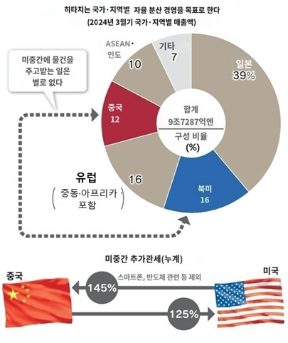 트럼프 관세로 인해 혼란이 계속되는 세계의 물류 흐름. 비즈니스에 미치는 영향을 최소화할 수 있는 경영 방식은 어떤 것일지, 모두가 궁금해하는 부분이다. 히타치 제작소는 ‘자율 분산형 글로벌 경영’이라는 방식을 10년 전부터 모색해 왔다. <2025년 4월21일 일본경제신문>