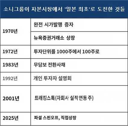 다음은 소니를 보자. 소니 그룹의 공동 창업자 모리타 아키오 회장은 자금을 자체 조달하는 직접 금융에 집착했다. 완전 시가 발행 증자나 개인 투자자 설명회 등을 통해 선구적인 역할을 하며 일본의 자본 시장 발전에 기여해 왔다.