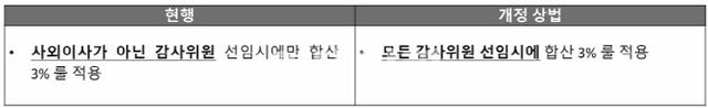 화우는 “대다수의 기업들이 사외이사들로 감사위원회를 구성해 왔기 때문에 사외이사가 아닌 감사위원만을 대상으로 하는 합산 3% 룰이 적용될 여지가 없었기 때문”이라고 현행 제도의 한계를 지적하며 이번 개정의 필요성을 설명했다.