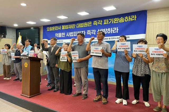 대책위는 지난달 22일 항소심 판결이 위법하고 부당하다며 공수처에 A판사를 직권남용 혐의로 고발한 바 있다. 합의부 재판임에도 배석판사 등과의 합의 절차 없이 즉시 선고를 내렸고, 다수의 방청객에게 직권남용강요·직권남용을 하는 불법을 저질렀다고 주장했다.