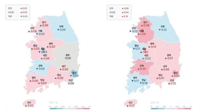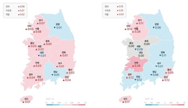 전국 17개 시도 중 △상승 14곳 △하락 3곳으로 상승지역이 우세했다. 지역별로는 △서울(0.08%) △경기(0.07%) △부산(0.04%) △광주(0.04%) 등이 올랐으며 △대전(-0.01%) △강원(-0.01%) △경남(-0.01%) 등은 떨어졌다.