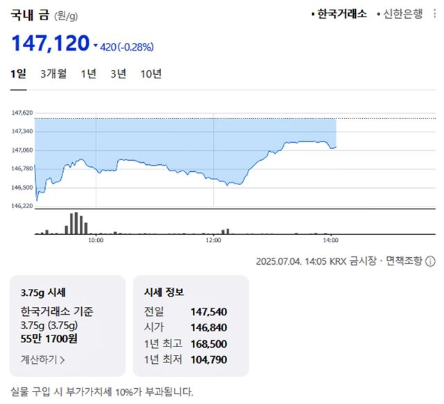 국내 금시세(금값)가 4일(한국 시각) 오후 하락세(전 거래일 대비)를 보이고 있다.
