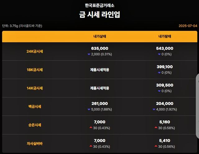 순금(24K) : 매입가 63만 6000원 / 매도가 54만 2000원