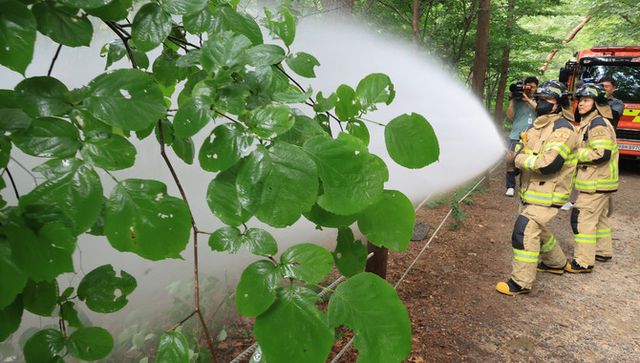 여야가 정쟁을 떠나 초당적인 '러브버그 잡기'에 나섰다. 사진은 지난 3일 서울 노원구 공릉동 삼육대학교에서 소방대원들이 물을 뿌리며 러브버그 현장 방제활동을 하는 모습. ⓒ 연합뉴스