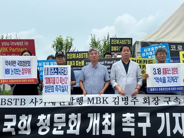 4일 오전 10시 30분 홈플러스 물품구매전단채피해자 비상대책위원회(이하 비대위)는 서울 여의도 국회 정문 앞에서 '홈플러스 국회 청문회 개최 촉구 기자회견'을 개최했다. 이날 기자회견에 참여한 이들은 홈플러스 근로자와 입점업체들의 생존권 보장과 홈플러스 유동화전단채(ABSTB) 피해자들의 보상을 위한 MBK의 경영 정상화 노력과 새 정부의 적극적인 개입을 촉구하고 나섰다. 이날 비대위는 국회 민원실을 찾아 윤한홍 국회 정무위원장과 강준현 국회 정무워원회 민주당 간사, 강민국 국민의힘 간사 의원실에 전달하는 민원서류 또한 접수한 것으로 나타났다.