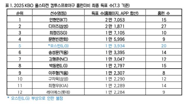LG 오스틴은 1만 3934표를 얻어 팬 투표 5위에 올랐으나 부상으로 올스타전 출전이 불발됐다. 오스틴의 자리는 차순위 득표 선수인 이주형(키움·1만 2307표)이 대신한다.