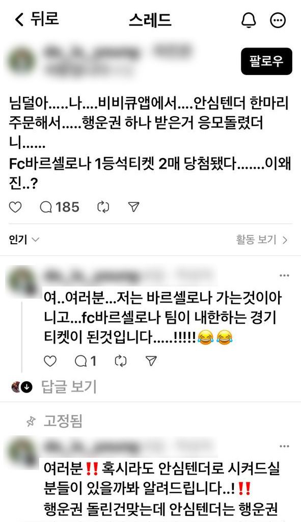 “표 구하러 중고거래 들어가지 말고, 그냥 BBQ앱 깔고 한 번 돌려봐라”는 말이 심심치 않게 들린다. 어쩌면 다음 당첨자는 당신일지도 모른다.