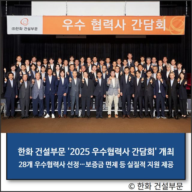 이날 한화는 △건축 △토목 △기계 △전기 분야에서 우수한 역량을 보인 협력사 28곳을 선정해 상패와 함께 운영자금 대여, 이행보증금 면제 등 인센티브를 제공했다. 또한 폭염 대응을 위한 '5대 수칙' 준수와 온열질환 예방 물품도 적극 지원할 계획이다.