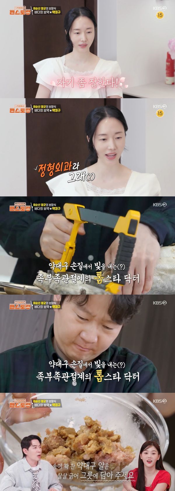 결국 이정현은 '정형외과 의사'인 남편에게 도움을 청했다. 그는 남편에게 "자기 여름 보양식으로 산 거다. 이순신 장군님의 보양식"이라고 설명하며 톱질을 부탁했다. 남편은 열심히 톱질을 했지만, 단단한 약대구를 자르는 일은 쉽지 않았다.