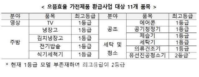 올해 에너지소비효율등급제로 관리가 시작된 식기세척기가 새롭게 환급 대상에 포함됐고, 1등급 제품이 없는 유선 진공청소기의 경우 2등급을 지원한다.