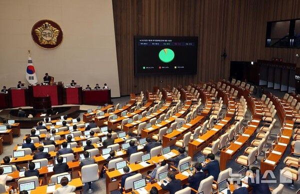 최 대변인은 "더 황당한 건, 본회의 개회 시간을 사전 통보도 없이 연기한 데다, 내부 이견으로 일정을 지연시킨 끝에 끝내 강행 처리에 나선 점"이라며 "이는 국회의 신뢰를 짓밟은 정치적 폭거이자, 국민에 대한 모욕"이라고 지적했다.