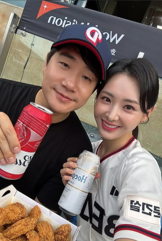 사진 속 배성재·김다영 부부는 야구장 관중석에서 나란히 앉아 맥주 캔을 들고 미소 지었다.