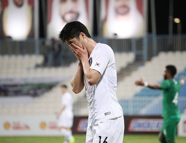 2019년 12월 31일 오후(현지시간) 아랍에미리트 아부다비 바니야스 스타디움에서 열린 대한민국과 사우디아라비아와의 평가전에서 기성용이 경기가 잘 안풀리자 얼굴을 감싸고 있다 / 연합뉴스