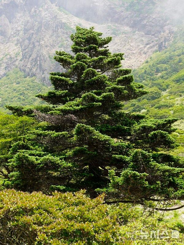 뉴시스 보도에 따르면, 제주도 세계유산본부는 5일 한라산국립공원 남벽 분기점에서 한라산 구상나무 대표목을 공개했다.