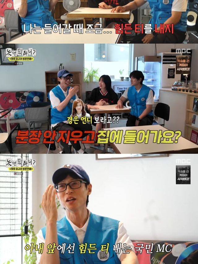 이에 별은 "분장 안 지우고 들어가냐"면서 "경은 언니 보라고"라고 말해며 웃음을 터트렸고, 유재석이 "가끔 나도 모르게 깜빡하고"라고 하자 "아내로서 효과가 좀 있는 것 같다"고 밝혔다.