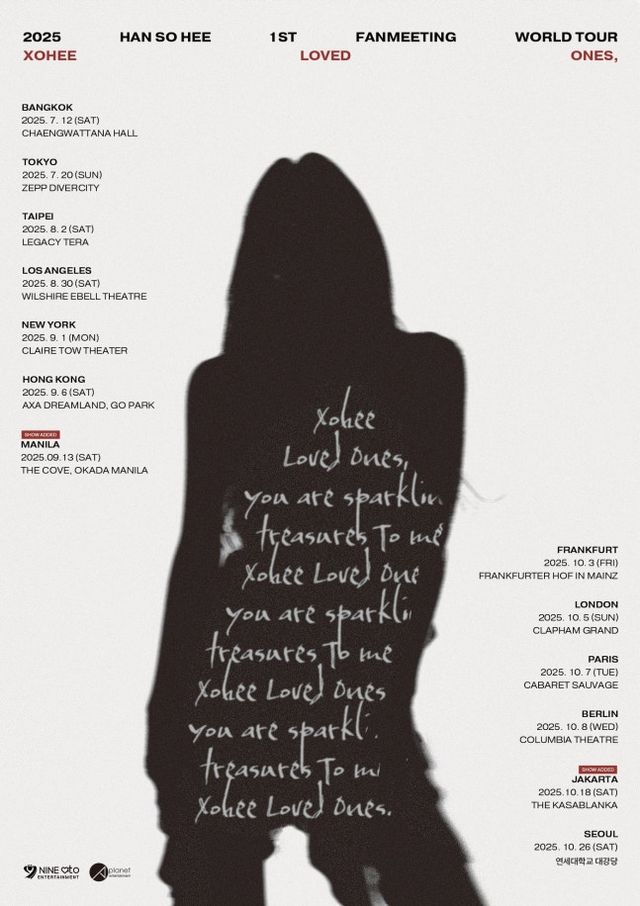 소속사 9아토엔터테인먼트에 따르면 한소희는 오는 3일 마닐라, 10월 18일 자카르타에서 ‘2025 한소희 퍼스트 팬미팅 월드투어 [소희 러브드 원즈,]’(2025 HAN SO HEE 1st FANMEETING WORLD TOUR [Xohee Loved Ones,])를 추가 개최하고 현지 팬들을 만난다.